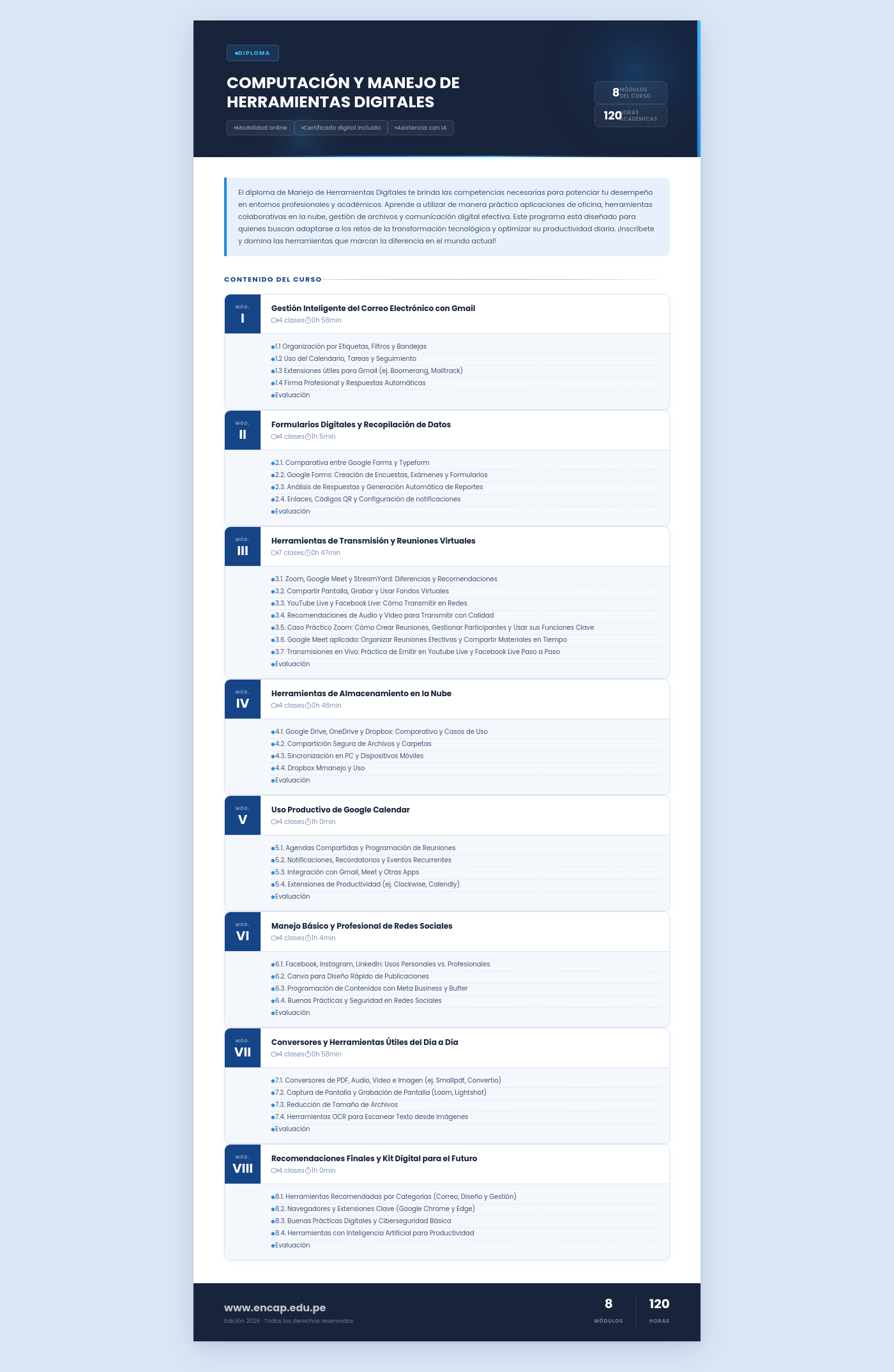 El diploma de Manejo de Herramientas Digitales te brinda las competencias necesarias para potenciar tu desempeño en entornos profesionales y académicos. Aprende a utilizar de manera práctica aplicaciones de oficina, herramientas colaborativas en la nube, gestión de archivos y comunicación digital efectiva. Este programa está diseñado para quienes buscan adaptarse a los retos de la transformación tecnológica y optimizar su productividad diaria. ¡Inscríbete y domina las herramientas que marcan la diferencia en el mundo actual!