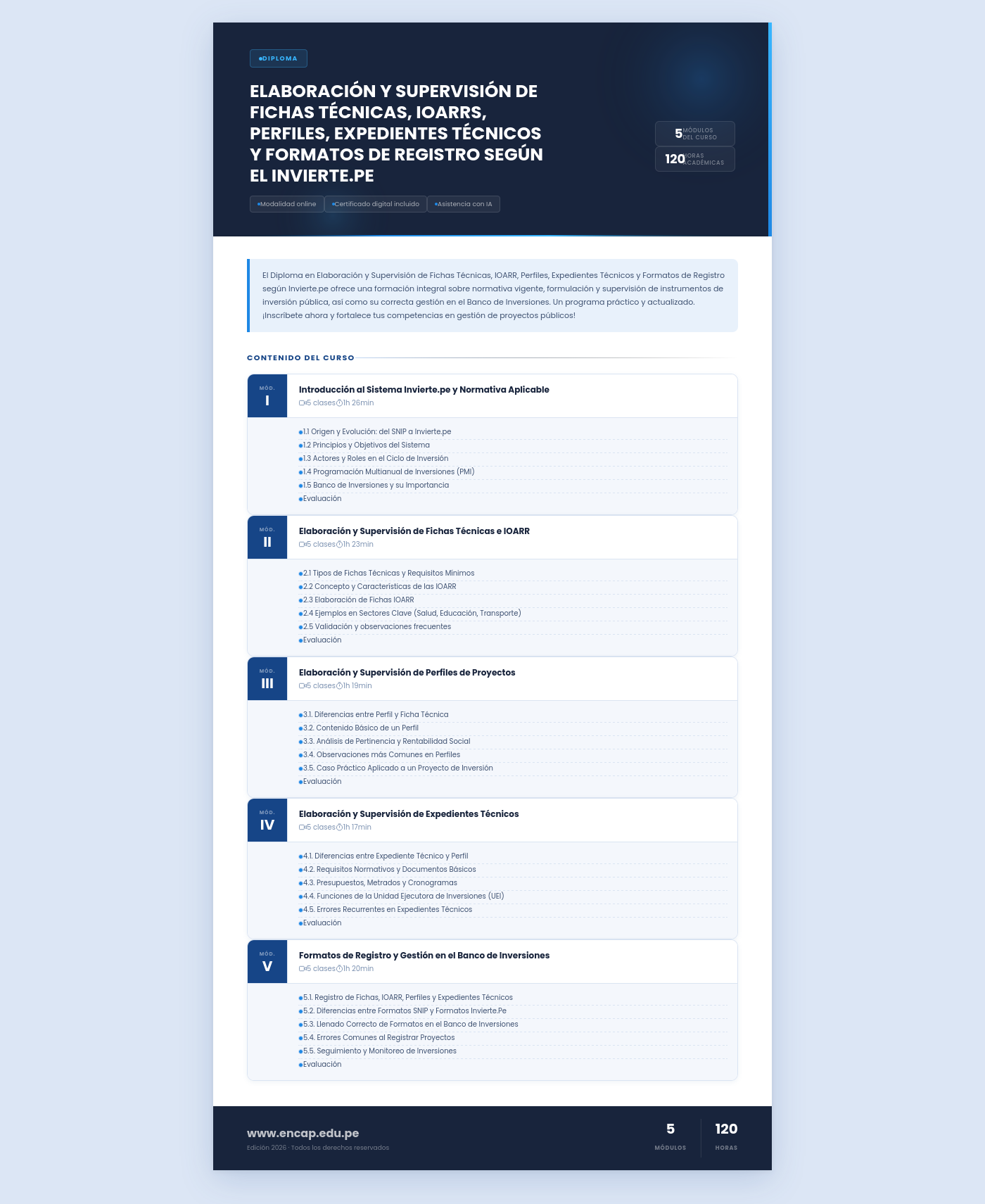 El Diploma en Elaboración y Supervisión de Fichas Técnicas, IOARR, Perfiles, Expedientes Técnicos y Formatos de Registro según Invierte.pe ofrece una formación integral sobre normativa vigente, formulación y supervisión de instrumentos de inversión pública, así como su correcta gestión en el Banco de Inversiones. Un programa práctico y actualizado. ¡Inscríbete ahora y fortalece tus competencias en gestión de proyectos públicos!
