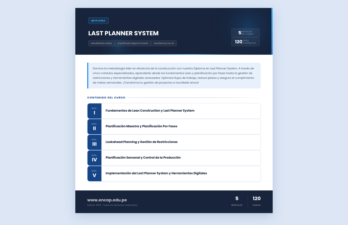 Domina la metodología líder en eficiencia de la construcción con nuestro Diploma en Last Planner System. A través de cinco módulos especializados, aprenderás desde los fundamentos Lean y planificación por fases hasta la gestión de restricciones y herramientas digitales avanzadas. Optimiza flujos de trabajo, reduce plazos y asegura el cumplimiento de metas semanales. ¡Transforma tu gestión de proyectos e inscríbete ahora!