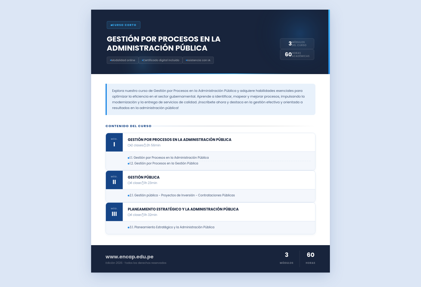 Explora nuestro curso de Gestión por Procesos en la Administración Pública y adquiere habilidades esenciales para optimizar la eficiencia en el sector gubernamental. Aprende a identificar, mapear y mejorar procesos, impulsando la modernización y la entrega de servicios de calidad. ¡Inscríbete ahora y destaca en la gestión efectiva y orientada a resultados en la administración pública!