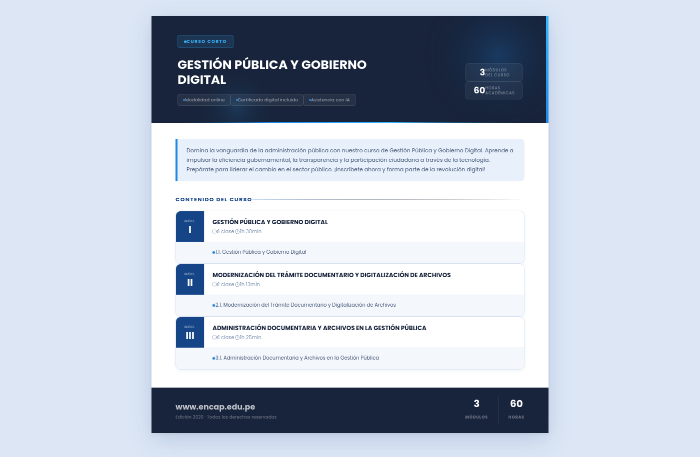 Domina la vanguardia de la administración pública con nuestro curso de Gestión Pública y Gobierno Digital. Aprende a impulsar la eficiencia gubernamental, la transparencia y la participación ciudadana a través de la tecnología. Prepárate para liderar el cambio en el sector público. ¡Inscríbete ahora y forma parte de la revolución digital!