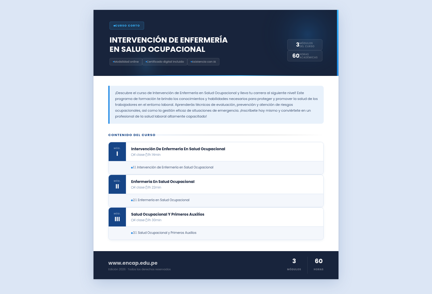 ¡Descubre el curso de Intervención de Enfermería en Salud Ocupacional y lleva tu carrera al siguiente nivel! Este programa de formación te brinda los conocimientos y habilidades necesarios para proteger y promover la salud de los trabajadores en el entorno laboral. Aprenderás técnicas de evaluación, prevención y atención de riesgos ocupacionales, así como la gestión eficaz de situaciones de emergencia. ¡Inscríbete hoy mismo y conviértete en un profesional de la salud laboral altamente capacitado!