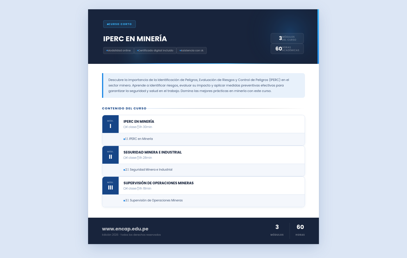 Descubre la importancia de la Identificación de Peligros, Evaluación de Riesgos y Control de Peligros (IPERC) en el sector minero. Aprende a identificar riesgos, evaluar su impacto y aplicar medidas preventivas efectivas para garantizar la seguridad y salud en el trabajo. Domina las mejores prácticas en minería con este curso.