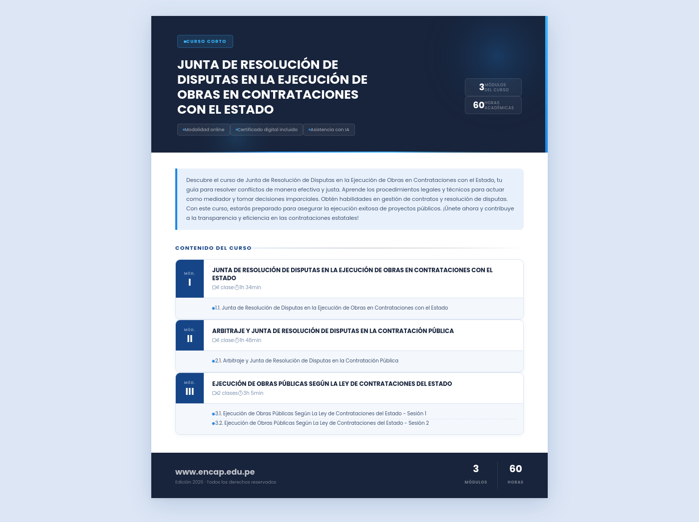 Descubre el curso de Junta de Resolución de Disputas en la Ejecución de Obras en Contrataciones con el Estado, tu guía para resolver conflictos de manera efectiva y justa. Aprende los procedimientos legales y técnicos para actuar como mediador y tomar decisiones imparciales. Obtén habilidades en gestión de contratos y resolución de disputas. Con este curso, estarás preparado para asegurar la ejecución exitosa de proyectos públicos. ¡Únete ahora y contribuye a la transparencia y eficiencia en las contrataciones estatales!