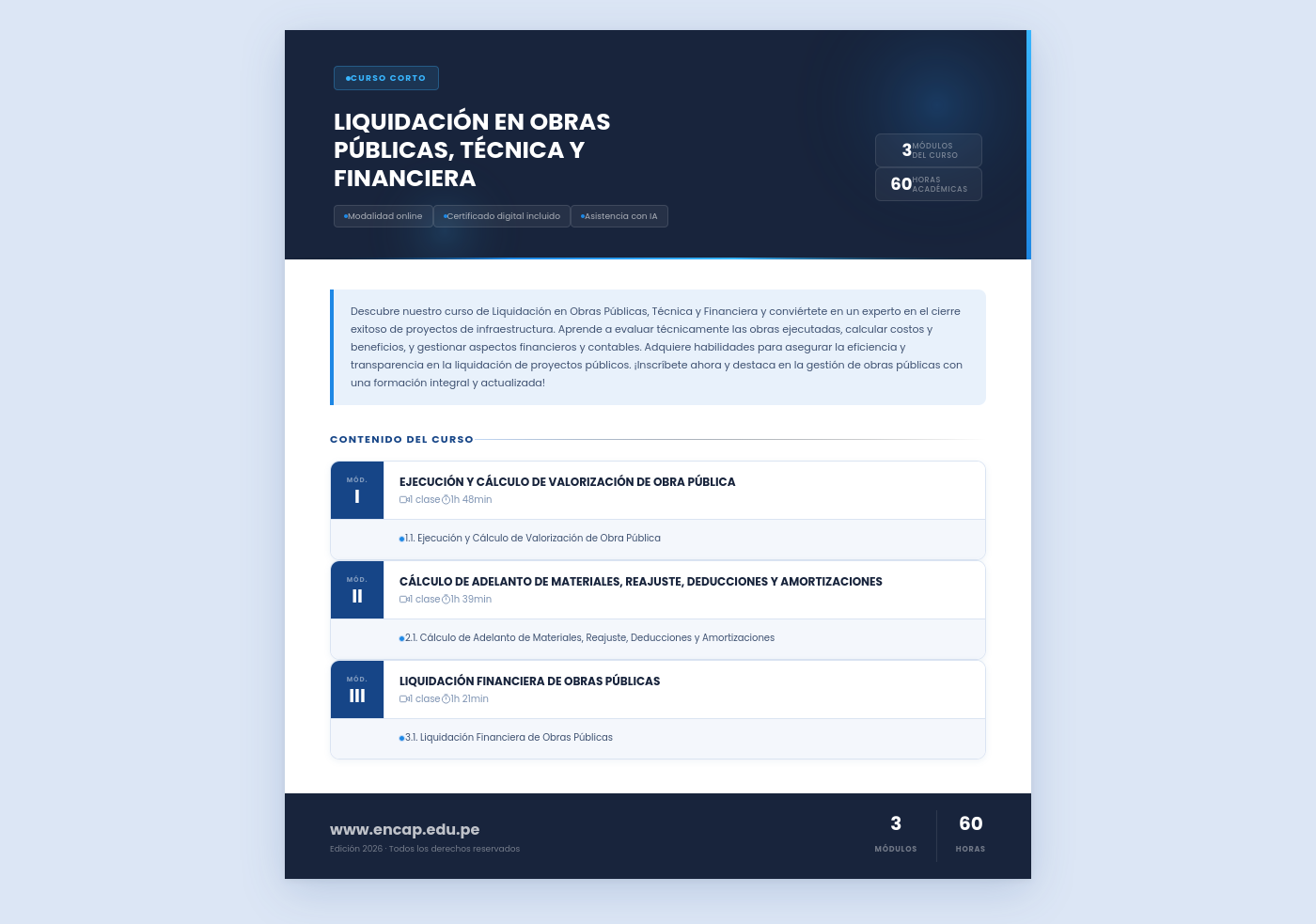 Descubre nuestro curso de Liquidación en Obras Públicas, Técnica y Financiera y conviértete en un experto en el cierre exitoso de proyectos de infraestructura. Aprende a evaluar técnicamente las obras ejecutadas, calcular costos y beneficios, y gestionar aspectos financieros y contables. Adquiere habilidades para asegurar la eficiencia y transparencia en la liquidación de proyectos públicos. ¡Inscríbete ahora y destaca en la gestión de obras públicas con una formación integral y actualizada!