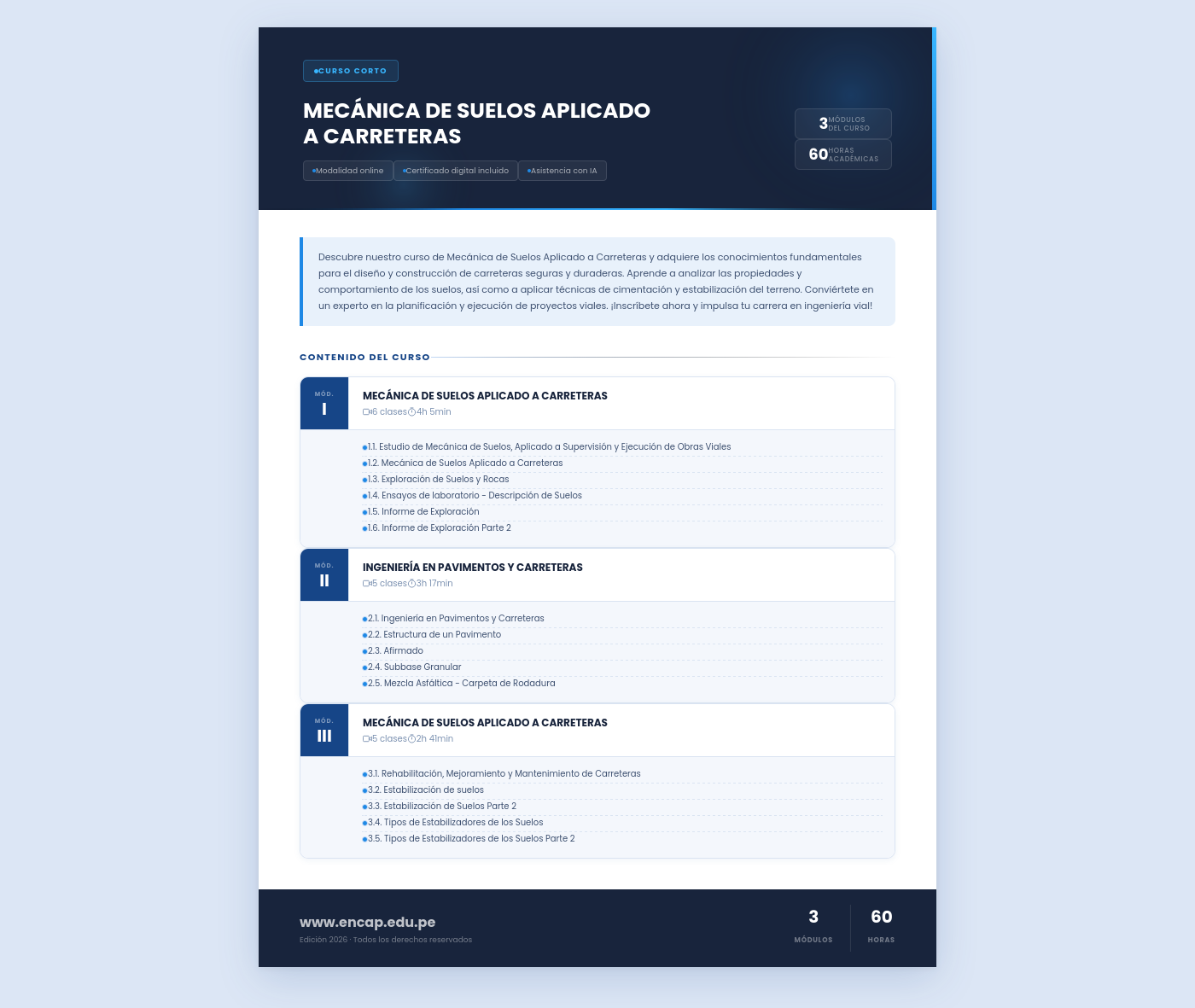 Descubre nuestro curso de Mecánica de Suelos Aplicado a Carreteras y adquiere los conocimientos fundamentales para el diseño y construcción de carreteras seguras y duraderas. Aprende a analizar las propiedades y comportamiento de los suelos, así como a aplicar técnicas de cimentación y estabilización del terreno. Conviértete en un experto en la planificación y ejecución de proyectos viales. ¡Inscríbete ahora y impulsa tu carrera en ingeniería vial!