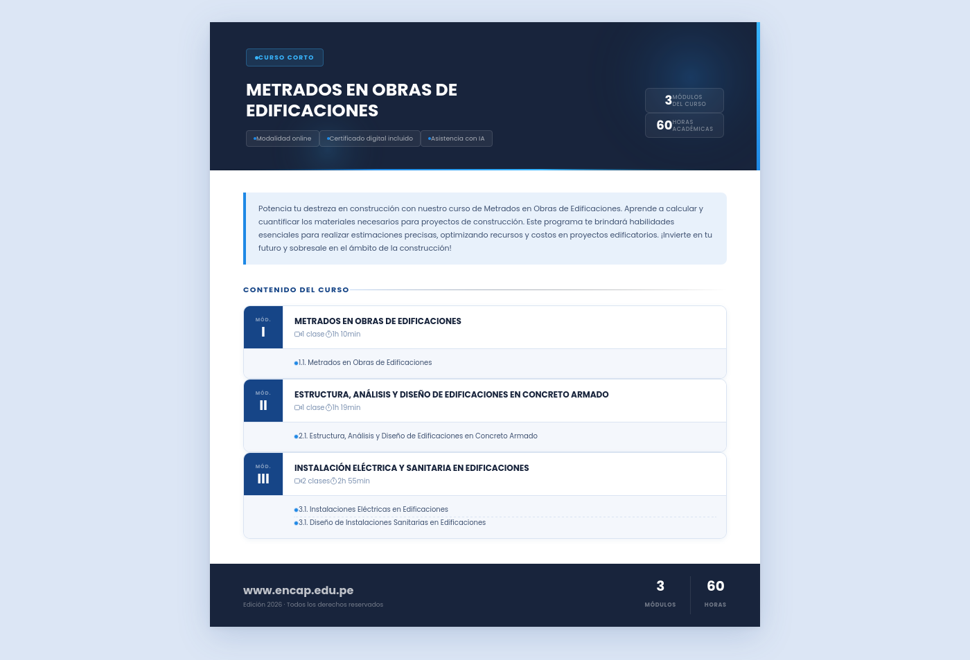 Potencia tu destreza en construcción con nuestro curso de Metrados en Obras de Edificaciones. Aprende a calcular y cuantificar los materiales necesarios para proyectos de construcción. Este programa te brindará habilidades esenciales para realizar estimaciones precisas, optimizando recursos y costos en proyectos edificatorios. ¡Invierte en tu futuro y sobresale en el ámbito de la construcción!