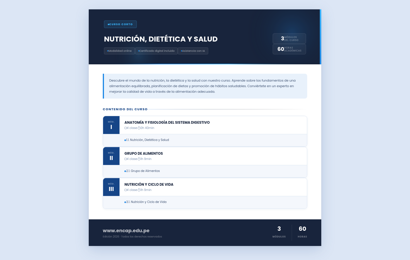 Descubre el mundo de la nutrición, la dietética y la salud con nuestro curso. Aprende sobre los fundamentos de una alimentación equilibrada, planificación de dietas y promoción de hábitos saludables. Conviértete en un experto en mejorar la calidad de vida a través de la alimentación adecuada.