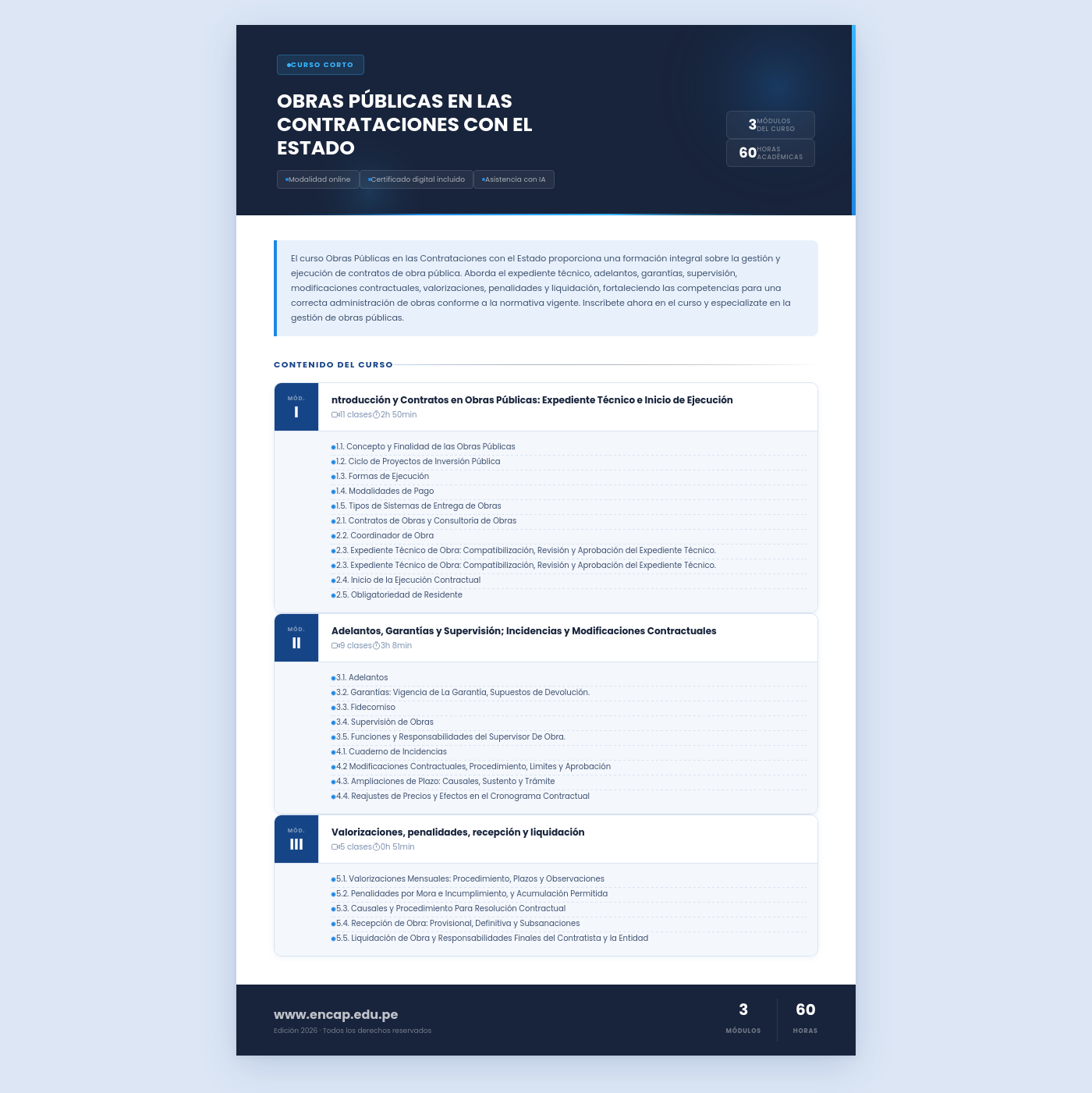 El curso Obras Públicas en las Contrataciones con el Estado proporciona una formación integral sobre la gestión y ejecución de contratos de obra pública. Aborda el expediente técnico, adelantos, garantías, supervisión, modificaciones contractuales, valorizaciones, penalidades y liquidación, fortaleciendo las competencias para una correcta administración de obras conforme a la normativa vigente. Inscríbete ahora en el curso y especialízate en la gestión de obras públicas.