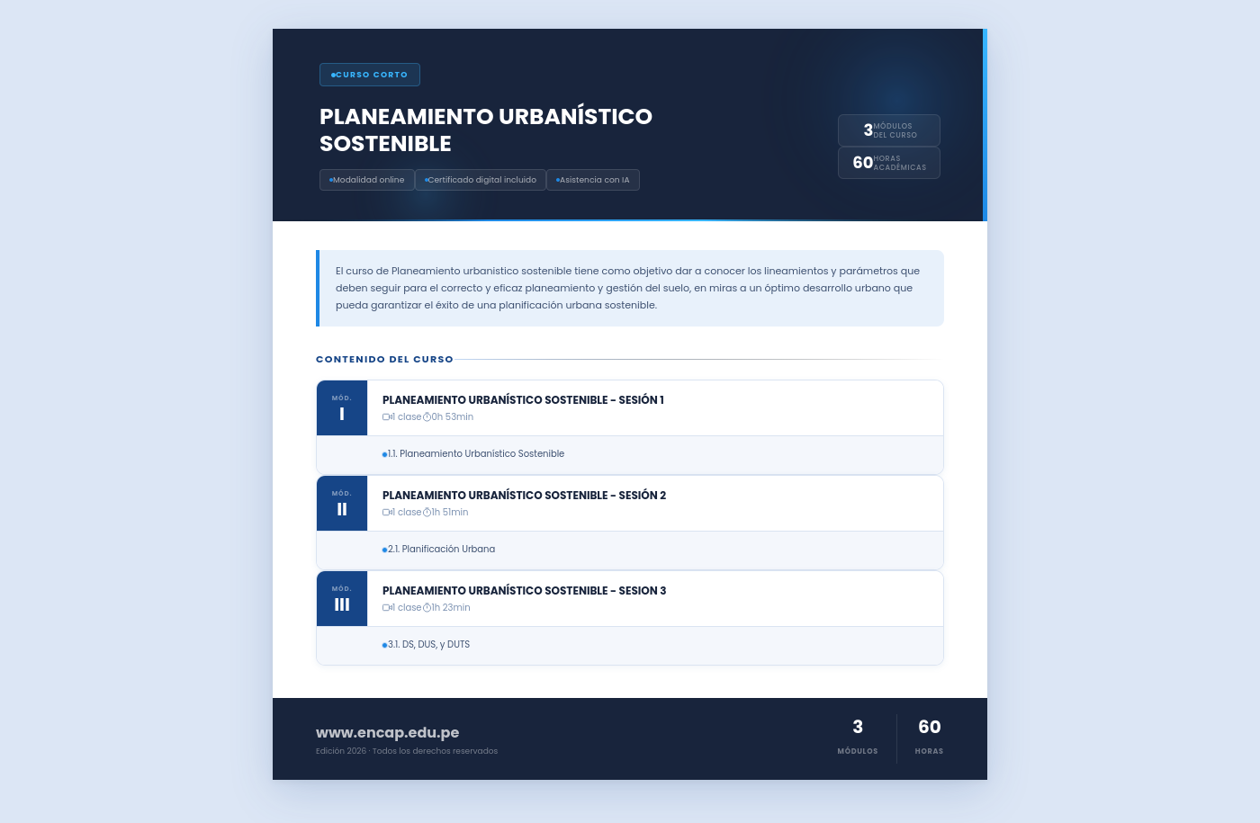 El curso de Planeamiento urbanistico sostenible tiene como objetivo dar a conocer los lineamientos y parámetros que deben seguir para el correcto y eficaz planeamiento y gestión del suelo, en miras a un óptimo desarrollo urbano que pueda garantizar el éxito de una planificación urbana sostenible.
