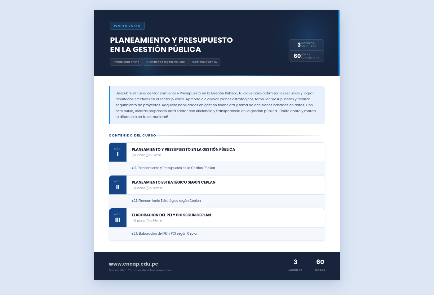 Descubre el curso de Planeamiento y Presupuesto en la Gestión Pública, tu clave para optimizar los recursos y lograr resultados efectivos en el sector público. Aprende a elaborar planes estratégicos, formular presupuestos y realizar seguimiento de proyectos. Adquiere habilidades en gestión financiera y toma de decisiones basadas en datos. Con este curso, estarás preparado para liderar con eficiencia y transparencia en la gestión pública. ¡Únete ahora y marca la diferencia en tu comunidad!
