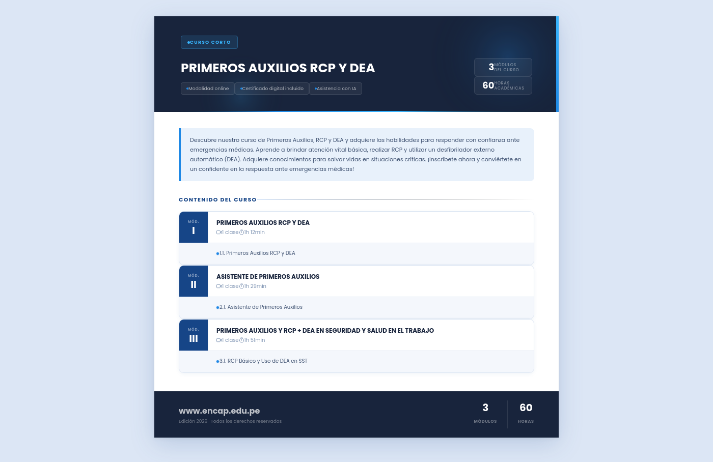 Descubre nuestro curso de Primeros Auxilios, RCP y DEA y adquiere las habilidades para responder con confianza ante emergencias médicas. Aprende a brindar atención vital básica, realizar RCP y utilizar un desfibrilador externo automático (DEA). Adquiere conocimientos para salvar vidas en situaciones críticas. ¡Inscríbete ahora y conviértete en un confidente en la respuesta ante emergencias médicas!