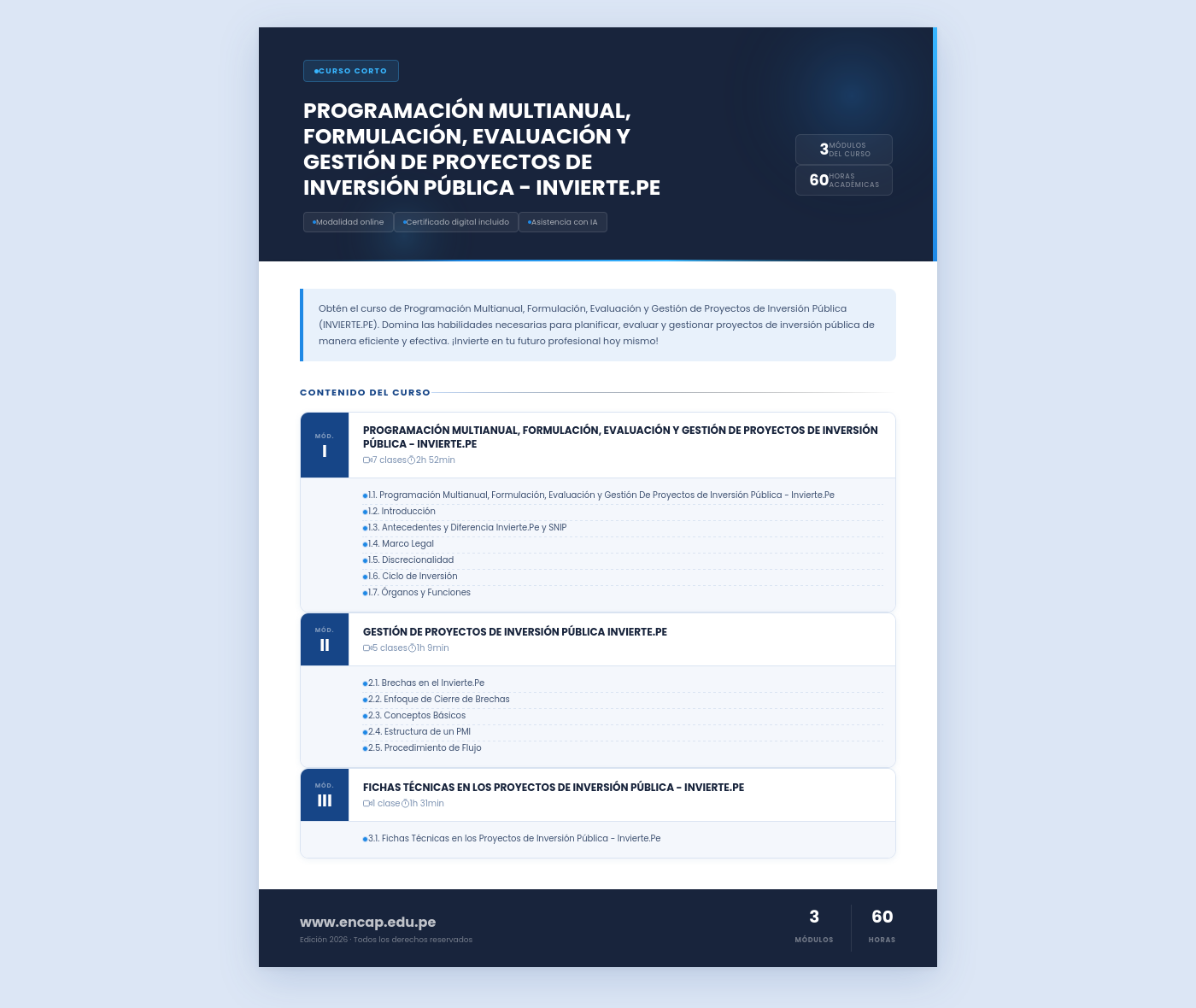 Obtén el curso de Programación Multianual, Formulación, Evaluación y Gestión de Proyectos de Inversión Pública (INVIERTE.PE). Domina las habilidades necesarias para planificar, evaluar y gestionar proyectos de inversión pública de manera eficiente y efectiva. ¡Invierte en tu futuro profesional hoy mismo!