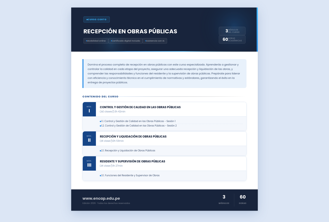 Domina el proceso completo de recepción en obras públicas con este curso especializado. Aprenderás a gestionar y controlar la calidad en cada etapa del proyecto, asegurar una adecuada recepción y liquidación de las obras, y comprender las responsabilidades y funciones del residente y la supervisión de obras públicas. Prepárate para liderar con eficiencia y conocimiento técnico en el cumplimiento de normativas y estándares, garantizando el éxito en la entrega de proyectos públicos.