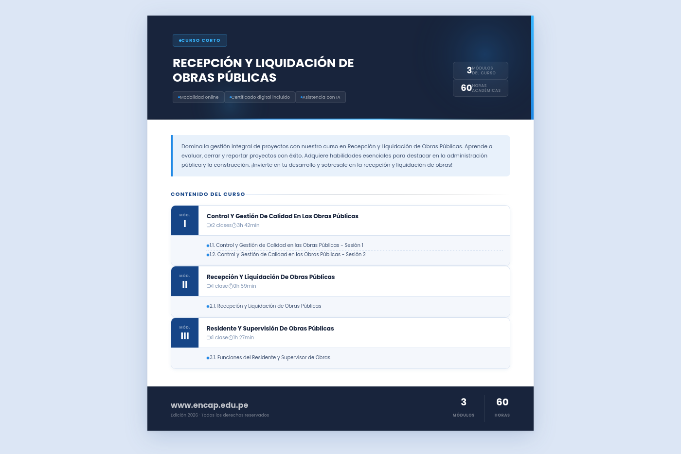 Domina la gestión integral de proyectos con nuestro curso en Recepción y Liquidación de Obras Públicas. Aprende a evaluar, cerrar y reportar proyectos con éxito. Adquiere habilidades esenciales para destacar en la administración pública y la construcción. ¡Invierte en tu desarrollo y sobresale en la recepción y liquidación de obras!