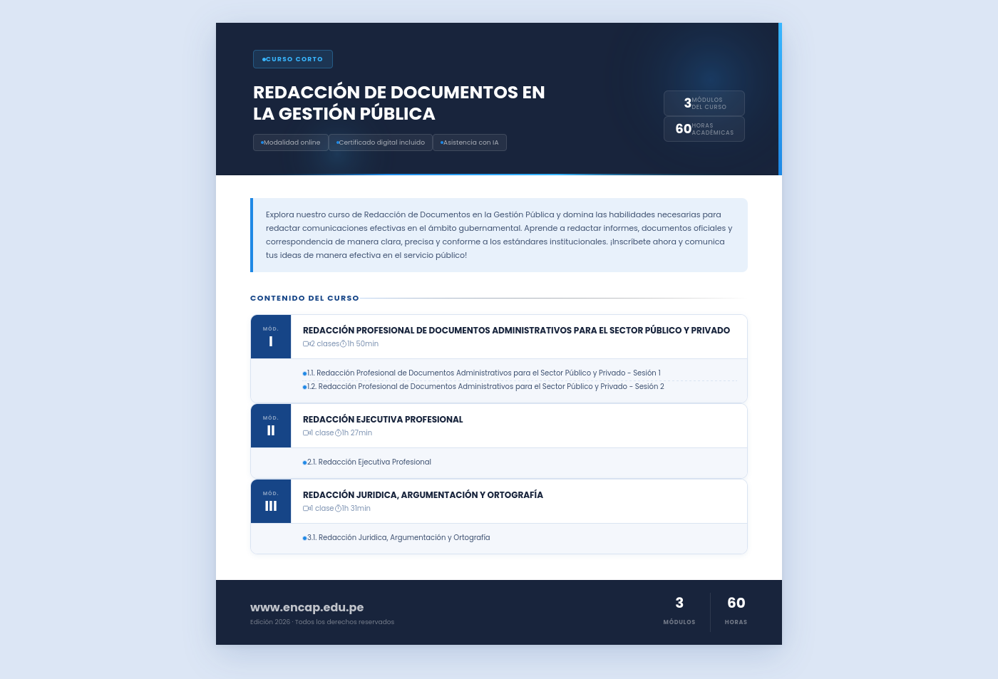 Explora nuestro curso de Redacción de Documentos en la Gestión Pública y domina las habilidades necesarias para redactar comunicaciones efectivas en el ámbito gubernamental. Aprende a redactar informes, documentos oficiales y correspondencia de manera clara, precisa y conforme a los estándares institucionales. ¡Inscríbete ahora y comunica tus ideas de manera efectiva en el servicio público!