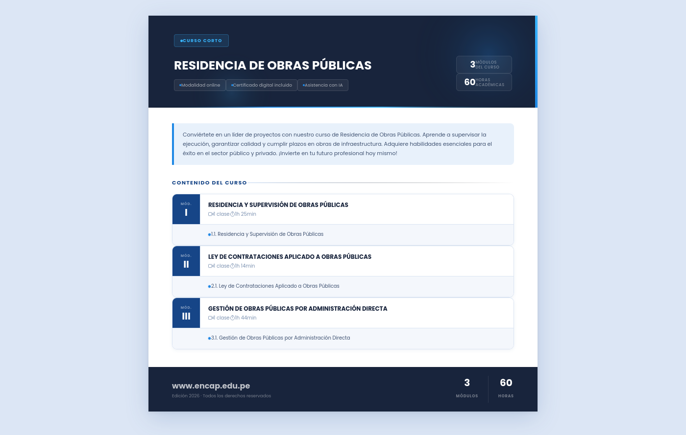 Conviértete en un líder de proyectos con nuestro curso de Residencia de Obras Públicas. Aprende a supervisar la ejecución, garantizar calidad y cumplir plazos en obras de infraestructura. Adquiere habilidades esenciales para el éxito en el sector público y privado. ¡Invierte en tu futuro profesional hoy mismo!