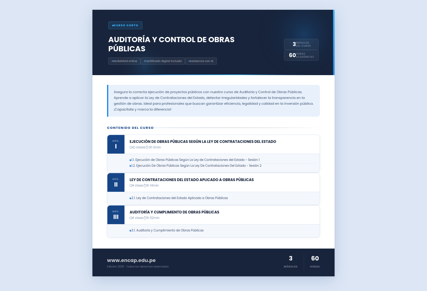 Asegura la correcta ejecución de proyectos públicos con nuestro curso de Auditoría y Control de Obras Públicas. Aprende a aplicar la Ley de Contrataciones del Estado, detectar irregularidades y fortalecer la transparencia en la gestión de obras. Ideal para profesionales que buscan garantizar eficiencia, legalidad y calidad en la inversión pública. ¡Capacítate y marca la diferencia!