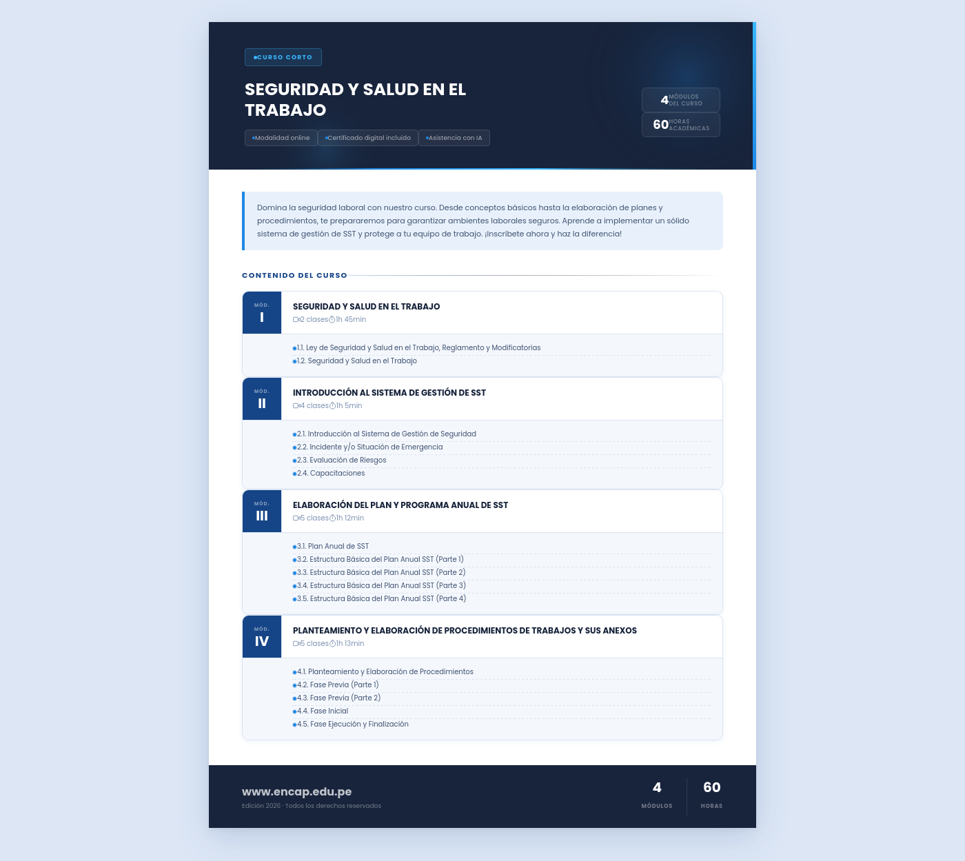 Domina la seguridad laboral con nuestro curso. Desde conceptos básicos hasta la elaboración de planes y procedimientos, te prepararemos para garantizar ambientes laborales seguros. Aprende a implementar un sólido sistema de gestión de SST y protege a tu equipo de trabajo. ¡Inscríbete ahora y haz la diferencia!