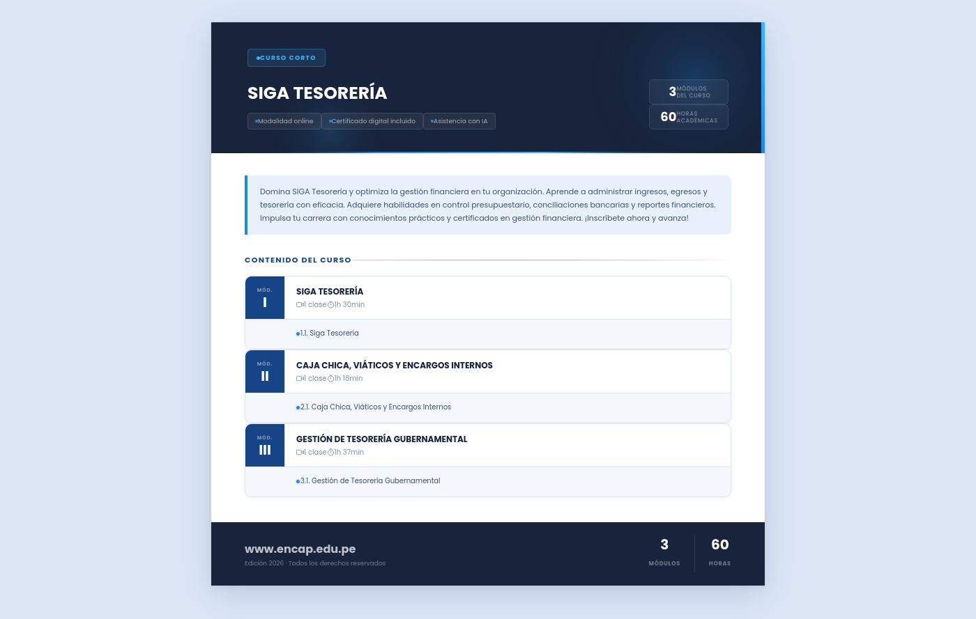 Domina SIGA Tesorería y optimiza la gestión financiera en tu organización. Aprende a administrar ingresos, egresos y tesorería con eficacia. Adquiere habilidades en control presupuestario, conciliaciones bancarias y reportes financieros. Impulsa tu carrera con conocimientos prácticos y certificados en gestión financiera. ¡Inscríbete ahora y avanza!