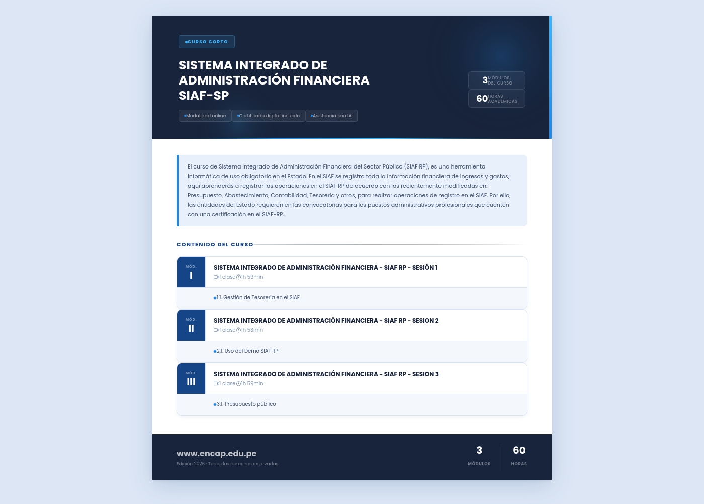 El curso de Sistema Integrado de Administración Financiera del Sector Público (SIAF RP), es una herramienta informática de uso obligatorio en el Estado. En el SIAF se registra toda la información financiera de ingresos y gastos, aquí aprenderás a registrar las operaciones en el SIAF RP de acuerdo con las recientemente modificadas en: Presupuesto, Abastecimiento, Contabilidad, Tesorería y otros, para realizar operaciones de registro en el SIAF. Por ello, las entidades del Estado requieren en las convocatorias para los puestos administrativos profesionales que cuenten con una certificación en el SIAF-RP.