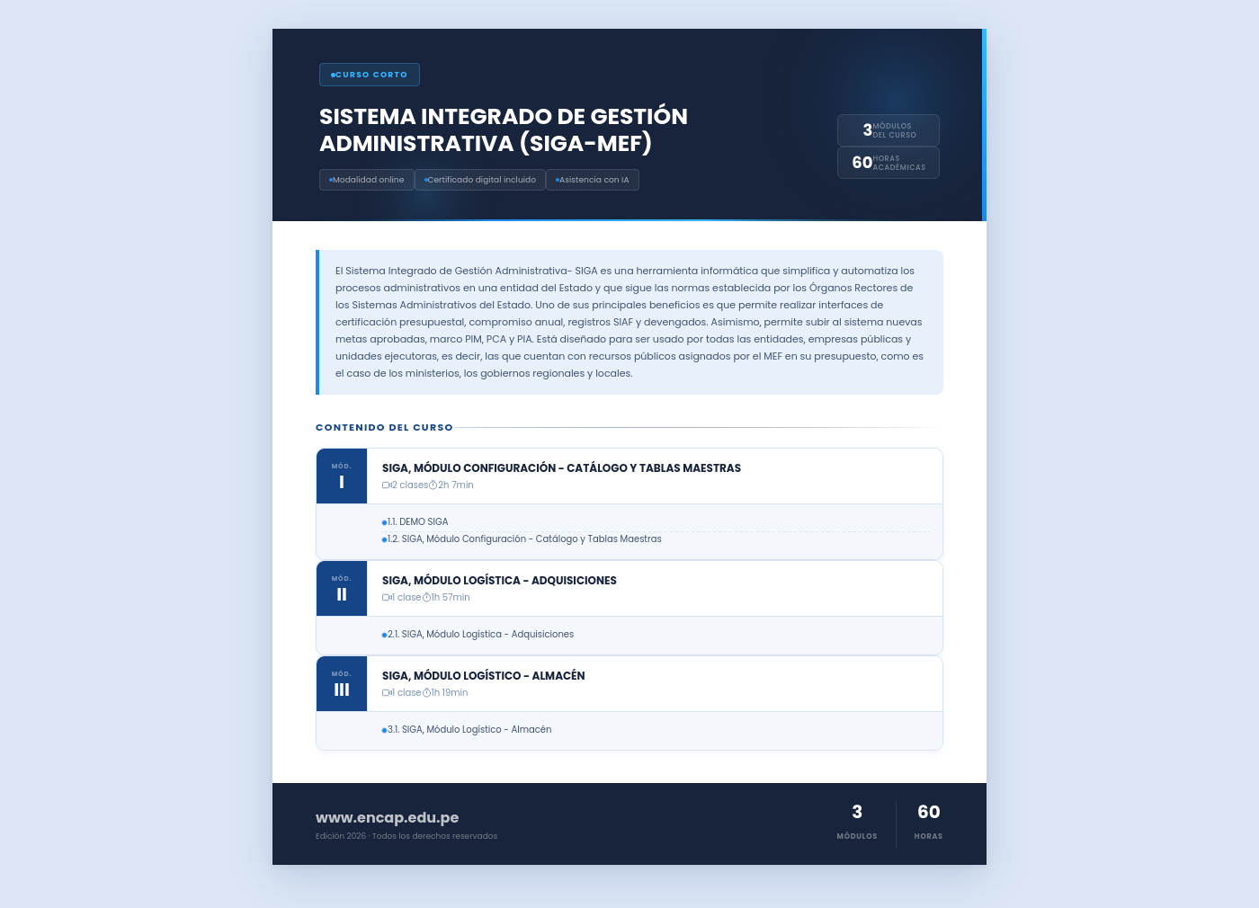 El Sistema Integrado de Gestión Administrativa- SIGA es una herramienta informática que simplifica y automatiza los procesos administrativos en una entidad del Estado y que sigue las normas establecida por los Órganos Rectores de los Sistemas Administrativos del Estado. Uno de sus principales beneficios es que permite realizar interfaces de certificación presupuestal, compromiso anual, registros SIAF y devengados. Asimismo, permite subir al sistema nuevas metas aprobadas, marco PIM, PCA y PIA. Está diseñado para ser usado por todas las entidades, empresas públicas y unidades ejecutoras, es decir, las que cuentan con recursos públicos asignados por el MEF en su presupuesto, como es el caso de los ministerios, los gobiernos regionales y locales.