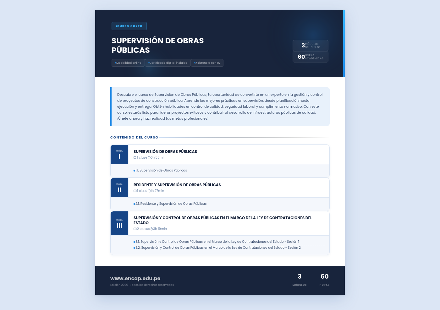 Descubre el curso de Supervisión de Obras Públicas, tu oportunidad de convertirte en un experto en la gestión y control de proyectos de construcción pública. Aprende las mejores prácticas en supervisión, desde planificación hasta ejecución y entrega. Obtén habilidades en control de calidad, seguridad laboral y cumplimiento normativo. Con este curso, estarás listo para liderar proyectos exitosos y contribuir al desarrollo de infraestructuras públicas de calidad. ¡Únete ahora y haz realidad tus metas profesionales!