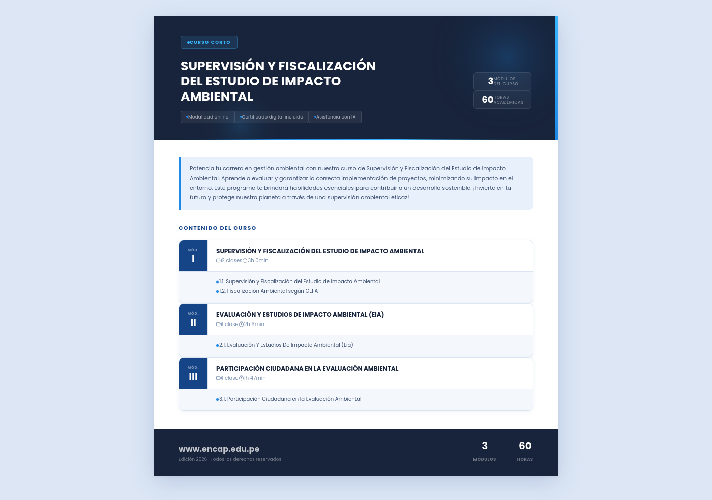 Potencia tu carrera en gestión ambiental con nuestro curso de Supervisión y Fiscalización del Estudio de Impacto Ambiental. Aprende a evaluar y garantizar la correcta implementación de proyectos, minimizando su impacto en el entorno. Este programa te brindará habilidades esenciales para contribuir a un desarrollo sostenible. ¡Invierte en tu futuro y protege nuestro planeta a través de una supervisión ambiental eficaz!