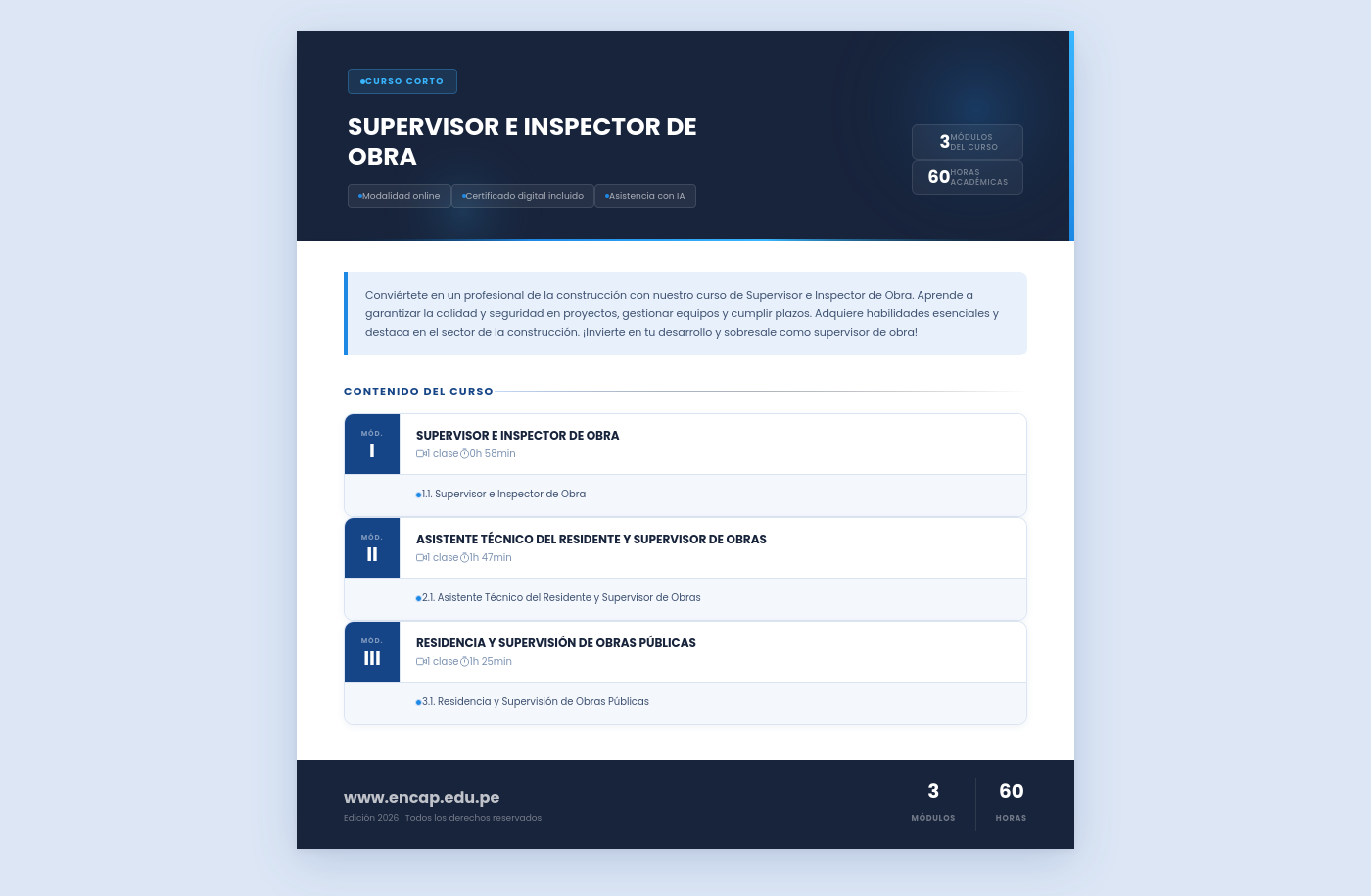 Conviértete en un profesional de la construcción con nuestro curso de Supervisor e Inspector de Obra. Aprende a garantizar la calidad y seguridad en proyectos, gestionar equipos y cumplir plazos. Adquiere habilidades esenciales y destaca en el sector de la construcción. ¡Invierte en tu desarrollo y sobresale como supervisor de obra!