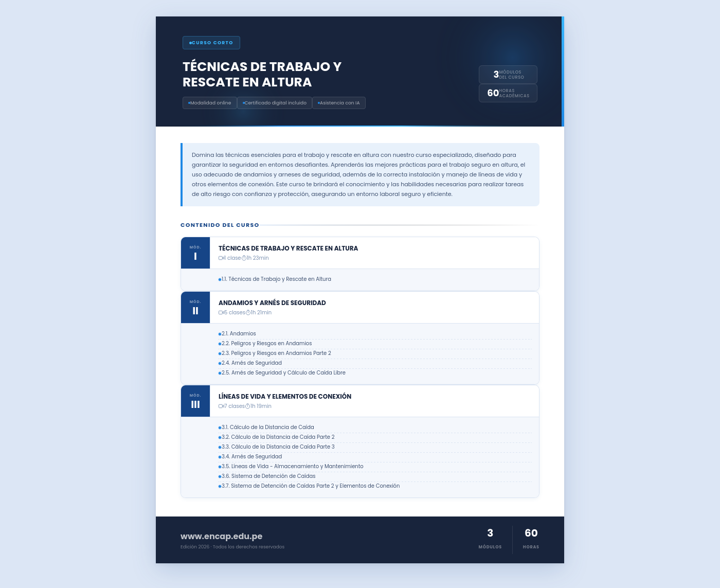 Domina las técnicas esenciales para el trabajo y rescate en altura con nuestro curso especializado, diseñado para garantizar la seguridad en entornos desafiantes. Aprenderás las mejores prácticas para el trabajo seguro en altura, el uso adecuado de andamios y arneses de seguridad, además de la correcta instalación y manejo de líneas de vida y otros elementos de conexión. Este curso te brindará el conocimiento y las habilidades necesarias para realizar tareas de alto riesgo con confianza y protección, asegurando un entorno laboral seguro y eficiente.