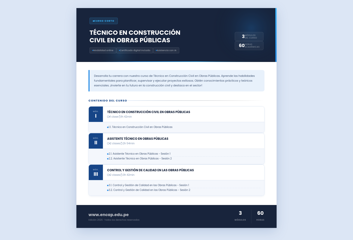 Desarrolla tu carrera con nuestro curso de Técnico en Construcción Civil en Obras Públicas. Aprende las habilidades fundamentales para planificar, supervisar y ejecutar proyectos exitosos. Obtén conocimientos prácticos y teóricos esenciales. ¡Invierte en tu futuro en la construcción civil y destaca en el sector!