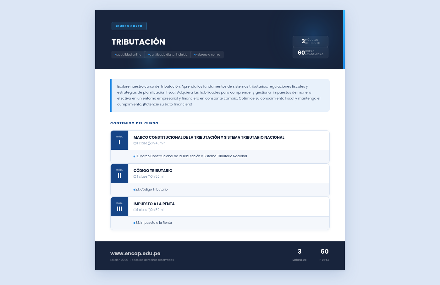 Explore nuestro curso de Tributación. Aprenda los fundamentos de sistemas tributarios, regulaciones fiscales y estrategias de planificación fiscal. Adquiera las habilidades para comprender y gestionar impuestos de manera efectiva en un entorno empresarial y financiero en constante cambio. Optimice su conocimiento fiscal y mantenga el cumplimiento. ¡Potencie su éxito financiero!