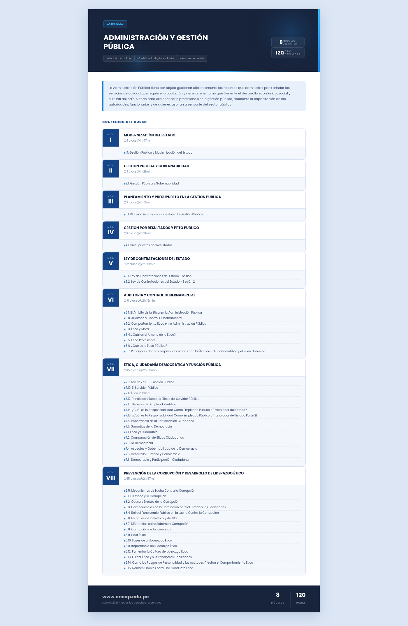 La Administración Pública tiene por objeto gestionar eficientemente los recursos que administra, para brindar los servicios de calidad que requiere la población y generar el entorno que fomente el desarrollo económico, social y cultural del país. Siendo para ello necesario profesionalizar la gestión pública, mediante la capacitación de las autoridades, funcionarios y de quienes aspiran a ser parte del sector público.