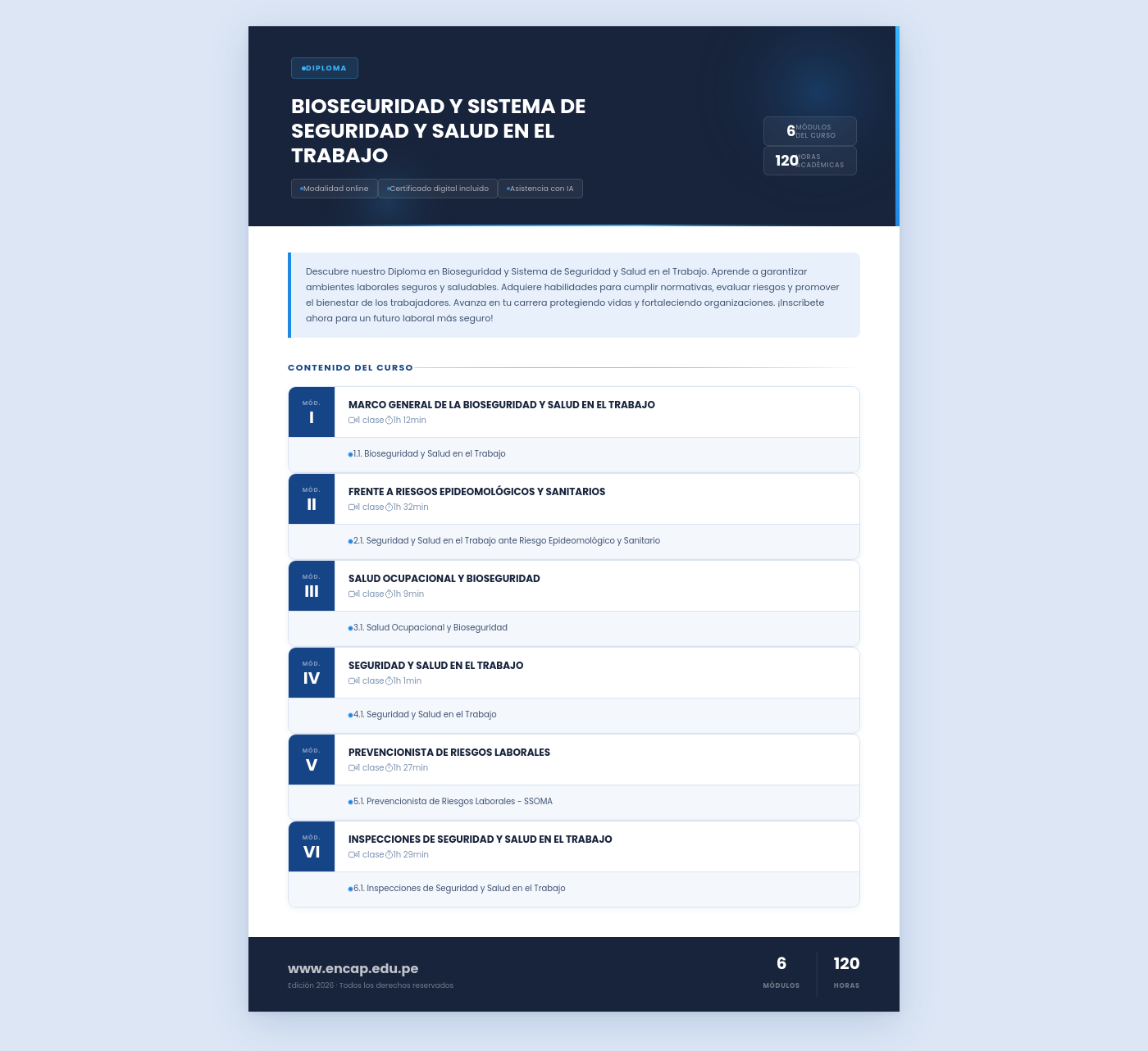 Descubre nuestro Diploma en Bioseguridad y Sistema de Seguridad y Salud en el Trabajo. Aprende a garantizar ambientes laborales seguros y saludables. Adquiere habilidades para cumplir normativas, evaluar riesgos y promover el bienestar de los trabajadores. Avanza en tu carrera protegiendo vidas y fortaleciendo organizaciones. ¡Inscríbete ahora para un futuro laboral más seguro!