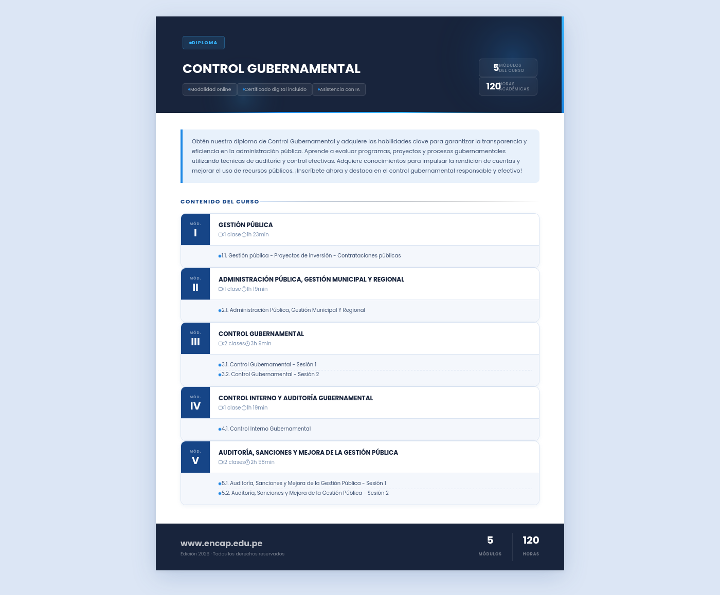Obtén nuestro diploma de Control Gubernamental y adquiere las habilidades clave para garantizar la transparencia y eficiencia en la administración pública. Aprende a evaluar programas, proyectos y procesos gubernamentales utilizando técnicas de auditoría y control efectivas. Adquiere conocimientos para impulsar la rendición de cuentas y mejorar el uso de recursos públicos. ¡Inscríbete ahora y destaca en el control gubernamental responsable y efectivo!