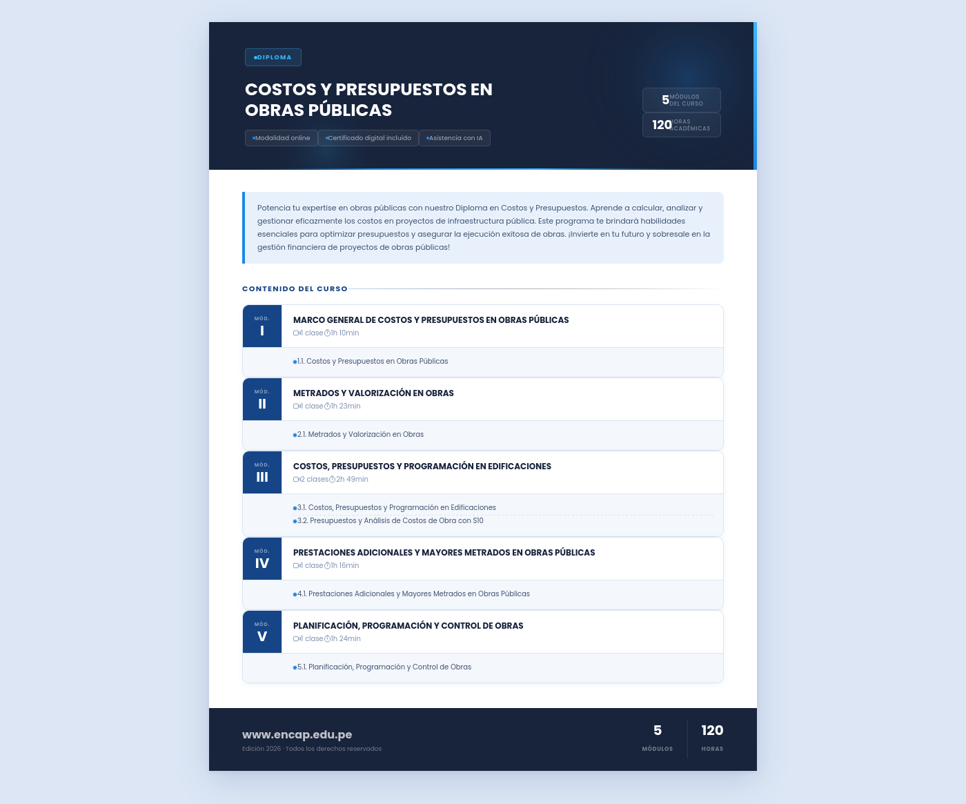 Potencia tu expertise en obras públicas con nuestro Diploma en Costos y Presupuestos. Aprende a calcular, analizar y gestionar eficazmente los costos en proyectos de infraestructura pública. Este programa te brindará habilidades esenciales para optimizar presupuestos y asegurar la ejecución exitosa de obras. ¡Invierte en tu futuro y sobresale en la gestión financiera de proyectos de obras públicas!