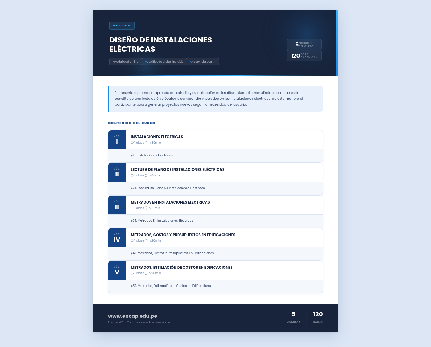 El presente diploma comprende del estudio y su aplicación de los diferentes sistemas eléctricos en que está constituido una instalación eléctrica y comprender metrados en las instalaciones electricas, de esta manera el participante podra generar proyectos nuevos según la necesidad del usuario.