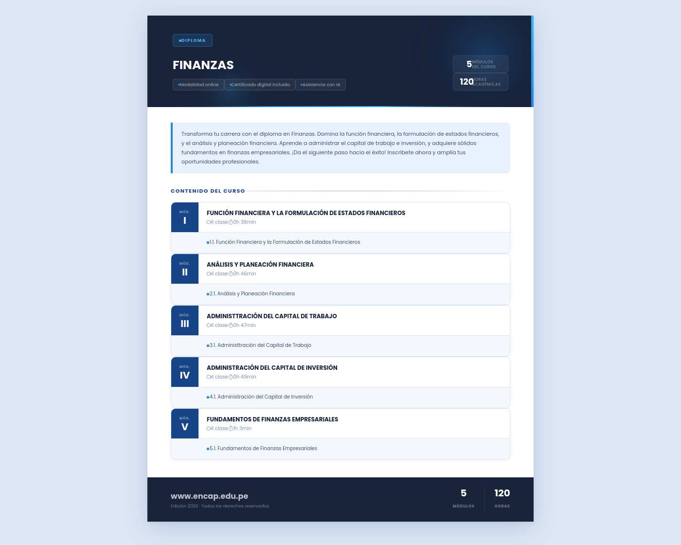 Transforma tu carrera con el diploma en Finanzas. Domina la función financiera, la formulación de estados financieros, y el análisis y planeación financiera. Aprende a administrar el capital de trabajo e inversión, y adquiere sólidos fundamentos en finanzas empresariales. ¡Da el siguiente paso hacia el éxito! Inscríbete ahora y amplía tus oportunidades profesionales.