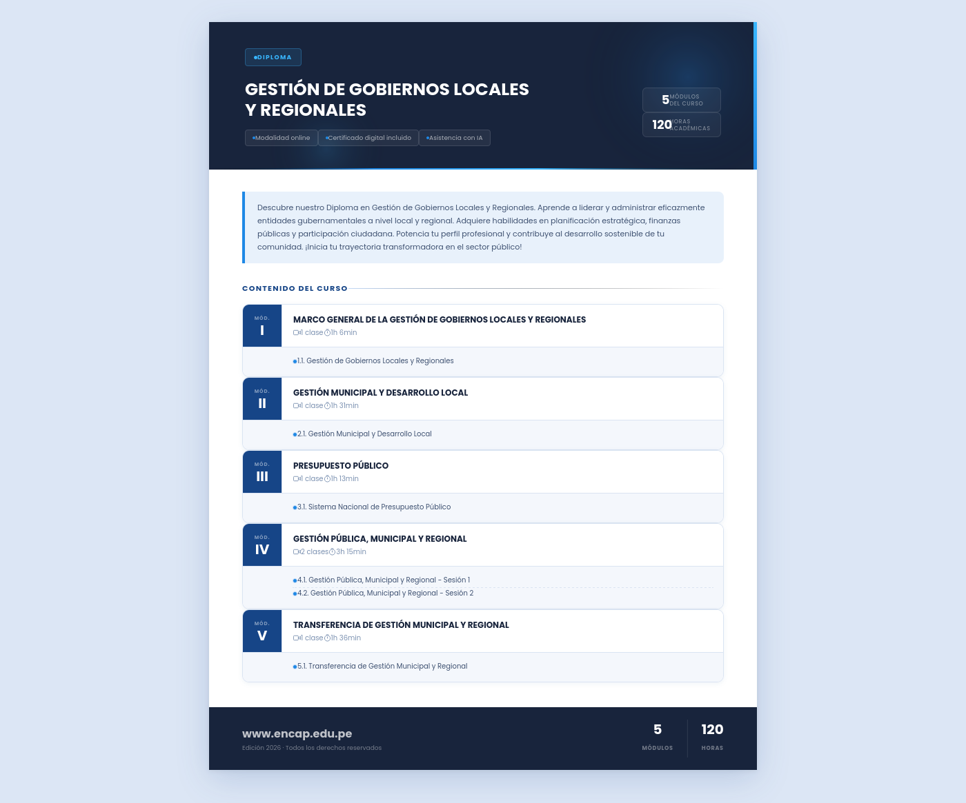 Descubre nuestro Diploma en Gestión de Gobiernos Locales y Regionales. Aprende a liderar y administrar eficazmente entidades gubernamentales a nivel local y regional. Adquiere habilidades en planificación estratégica, finanzas públicas y participación ciudadana. Potencia tu perfil profesional y contribuye al desarrollo sostenible de tu comunidad. ¡Inicia tu trayectoria transformadora en el sector público!