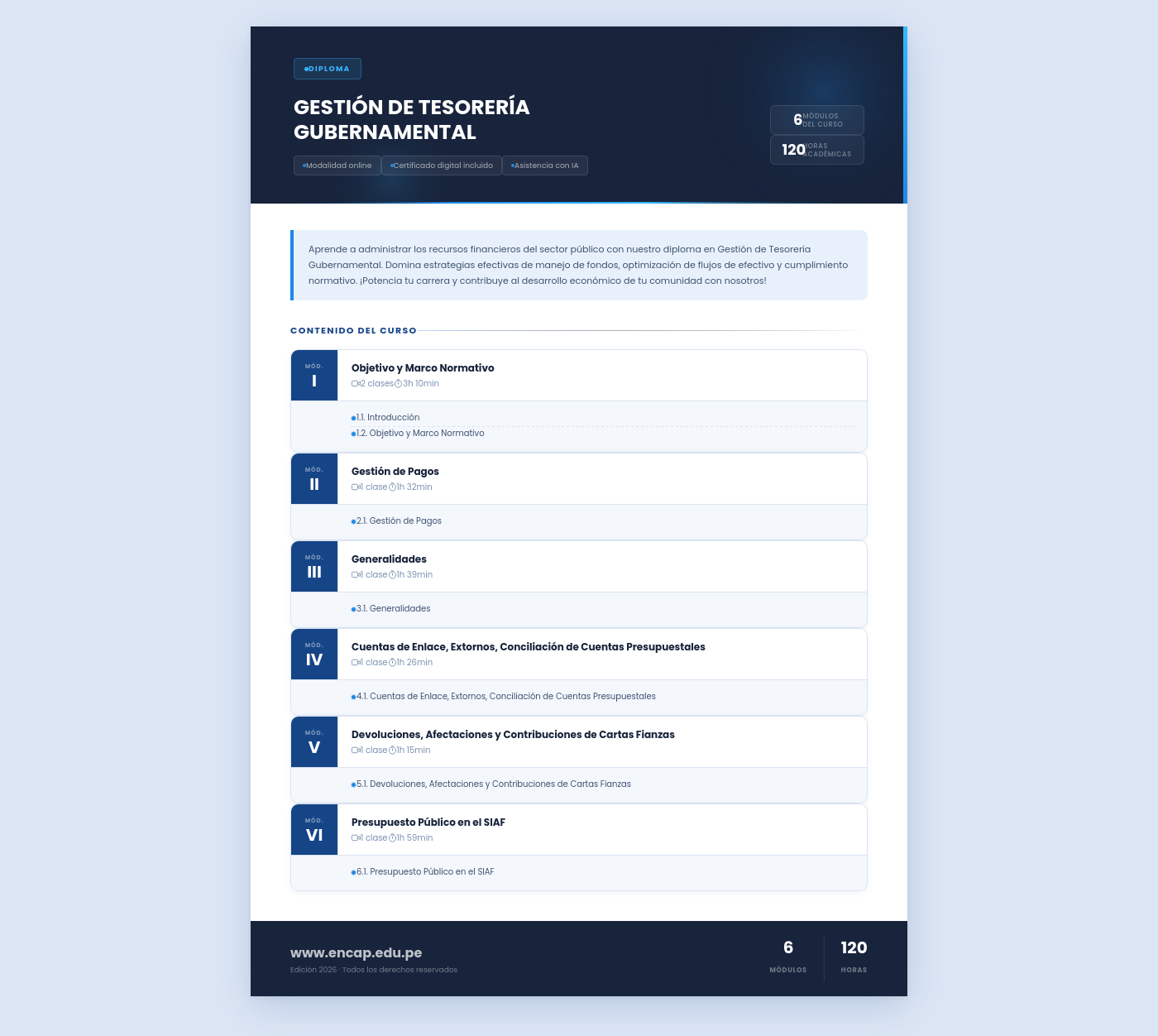 Aprende a administrar los recursos financieros del sector público con nuestro diploma en Gestión de Tesorería Gubernamental. Domina estrategias efectivas de manejo de fondos, optimización de flujos de efectivo y cumplimiento normativo. ¡Potencia tu carrera y contribuye al desarrollo económico de tu comunidad con nosotros!