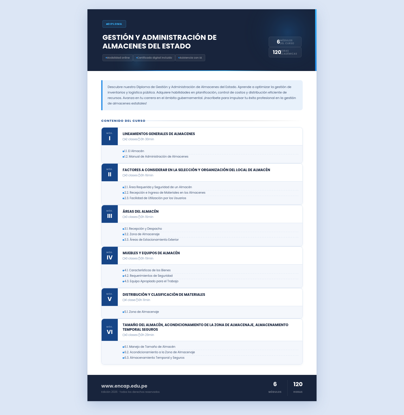 Descubre nuestro Diploma de Gestión y Administración de Almacenes del Estado. Aprende a optimizar la gestión de inventarios y logística pública. Adquiere habilidades en planificación, control de costos y distribución eficiente de recursos. Avanza en tu carrera en el ámbito gubernamental. ¡Inscríbete para impulsar tu éxito profesional en la gestión de almacenes estatales!