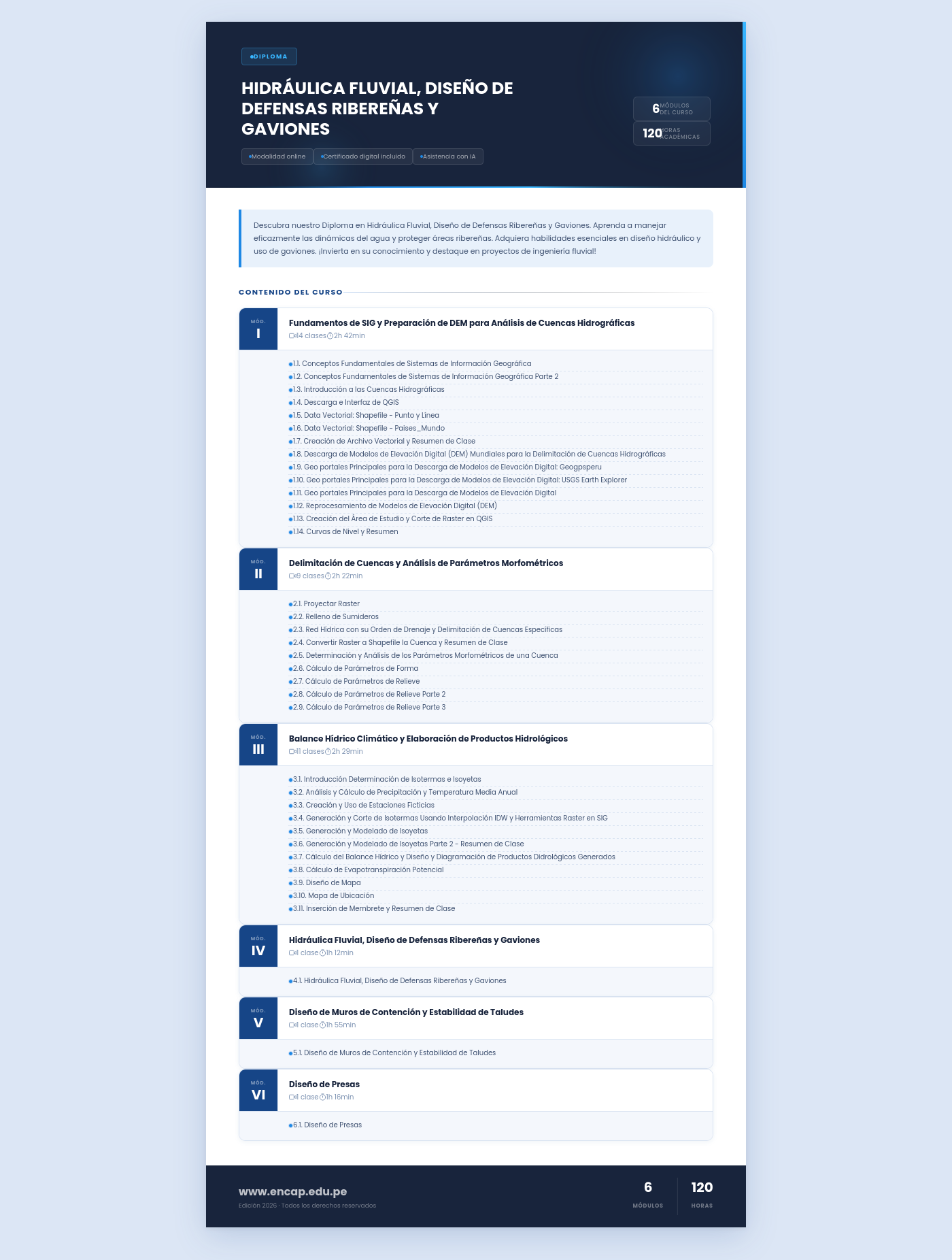 Descubra nuestro Diploma en Hidráulica Fluvial, Diseño de Defensas Ribereñas y Gaviones. Aprenda a manejar eficazmente las dinámicas del agua y proteger áreas ribereñas. Adquiera habilidades esenciales en diseño hidráulico y uso de gaviones. ¡Invierta en su conocimiento y destaque en proyectos de ingeniería fluvial!