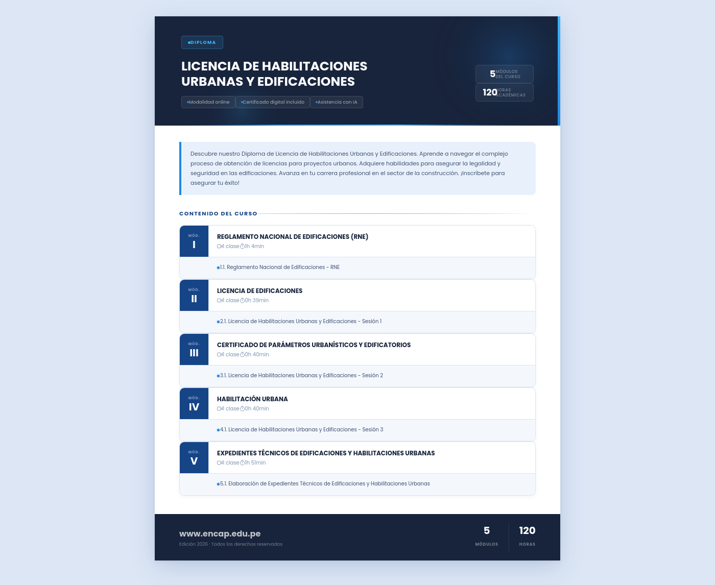Descubre nuestro Diploma de Licencia de Habilitaciones Urbanas y Edificaciones. Aprende a navegar el complejo proceso de obtención de licencias para proyectos urbanos. Adquiere habilidades para asegurar la legalidad y seguridad en las edificaciones. Avanza en tu carrera profesional en el sector de la construcción. ¡Inscríbete para asegurar tu éxito!
