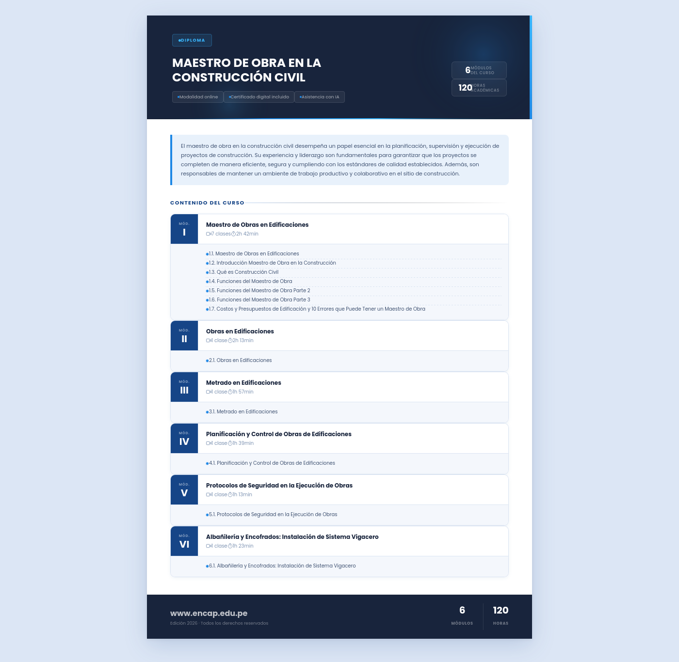 El maestro de obra en la construcción civil desempeña un papel esencial en la planificación, supervisión y ejecución de proyectos de construcción. Su experiencia y liderazgo son fundamentales para garantizar que los proyectos se completen de manera eficiente, segura y cumpliendo con los estándares de calidad establecidos. Además, son responsables de mantener un ambiente de trabajo productivo y colaborativo en el sitio de construcción.