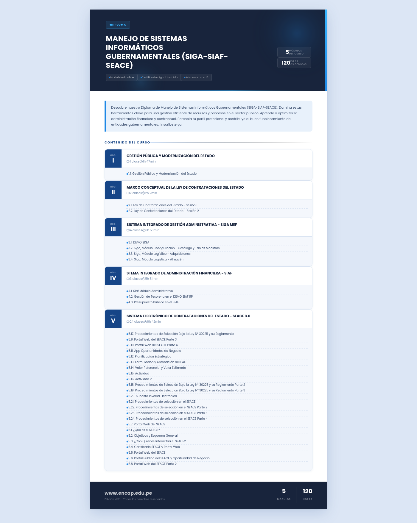 Descubre nuestro Diploma de Manejo de Sistemas Informáticos Gubernamentales (SIGA-SIAF-SEACE). Domina estas herramientas clave para una gestión eficiente de recursos y procesos en el sector público. Aprende a optimizar la administración financiera y contractual. Potencia tu perfil profesional y contribuye al buen funcionamiento de entidades gubernamentales. ¡Inscríbete ya!