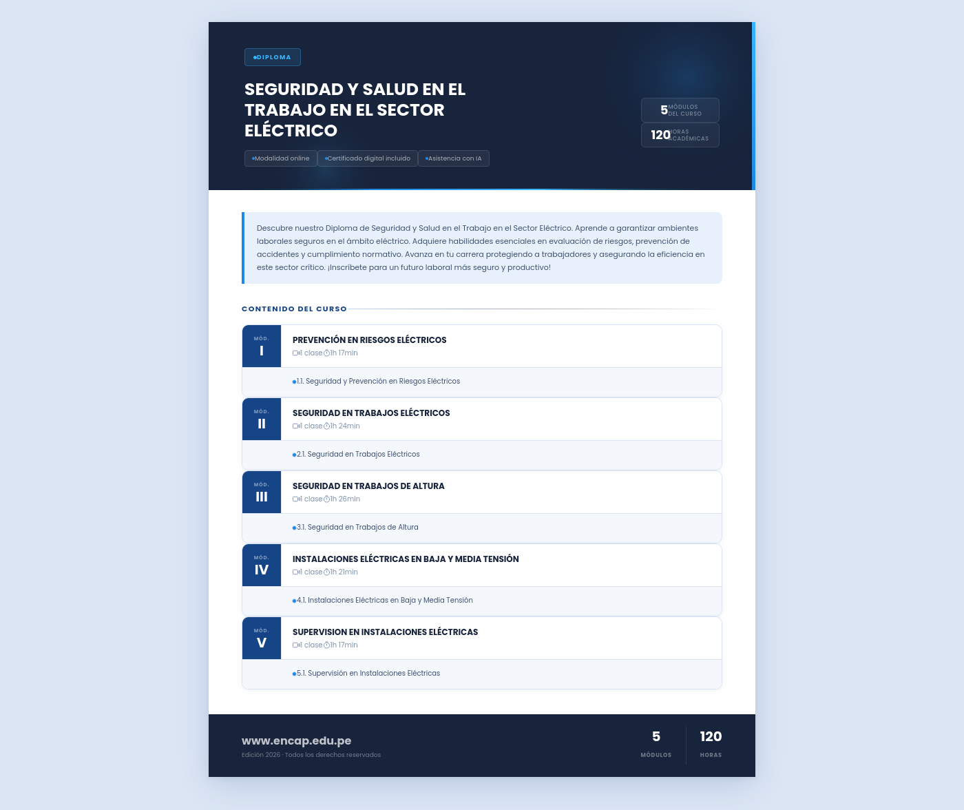 Descubre nuestro Diploma de Seguridad y Salud en el Trabajo en el Sector Eléctrico. Aprende a garantizar ambientes laborales seguros en el ámbito eléctrico. Adquiere habilidades esenciales en evaluación de riesgos, prevención de accidentes y cumplimiento normativo. Avanza en tu carrera protegiendo a trabajadores y asegurando la eficiencia en este sector crítico. ¡Inscríbete para un futuro laboral más seguro y productivo!
