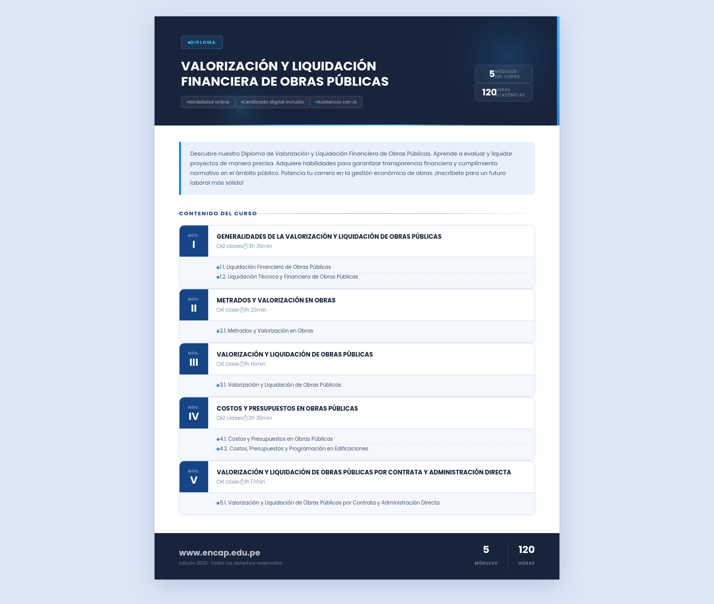 Descubre nuestro Diploma de Valorización y Liquidación Financiera de Obras Públicas. Aprende a evaluar y liquidar proyectos de manera precisa. Adquiere habilidades para garantizar transparencia financiera y cumplimiento normativo en el ámbito público. Potencia tu carrera en la gestión económica de obras. ¡Inscríbete para un futuro laboral más sólido!