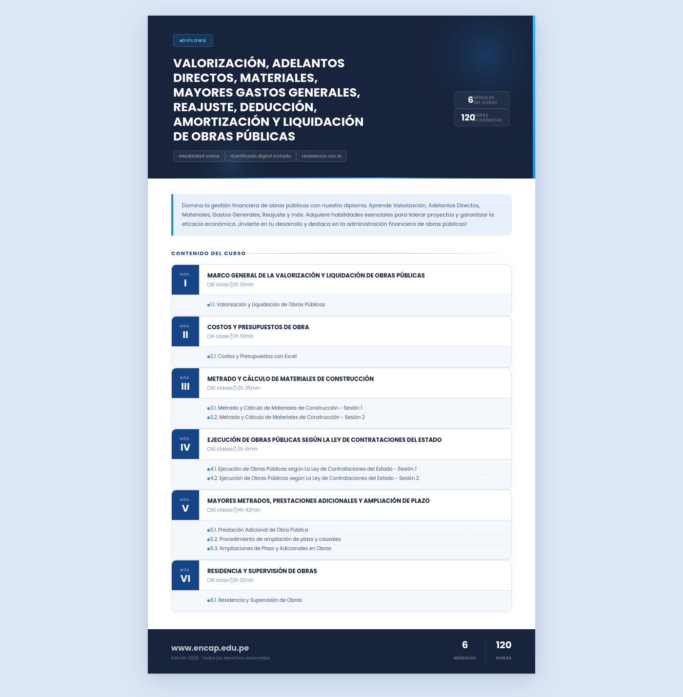 Domina la gestión financiera de obras públicas con nuestro diploma. Aprende Valorización, Adelantos Directos, Materiales, Gastos Generales, Reajuste y más. Adquiere habilidades esenciales para liderar proyectos y garantizar la eficacia económica. ¡Invierte en tu desarrollo y destaca en la administración financiera de obras públicas!