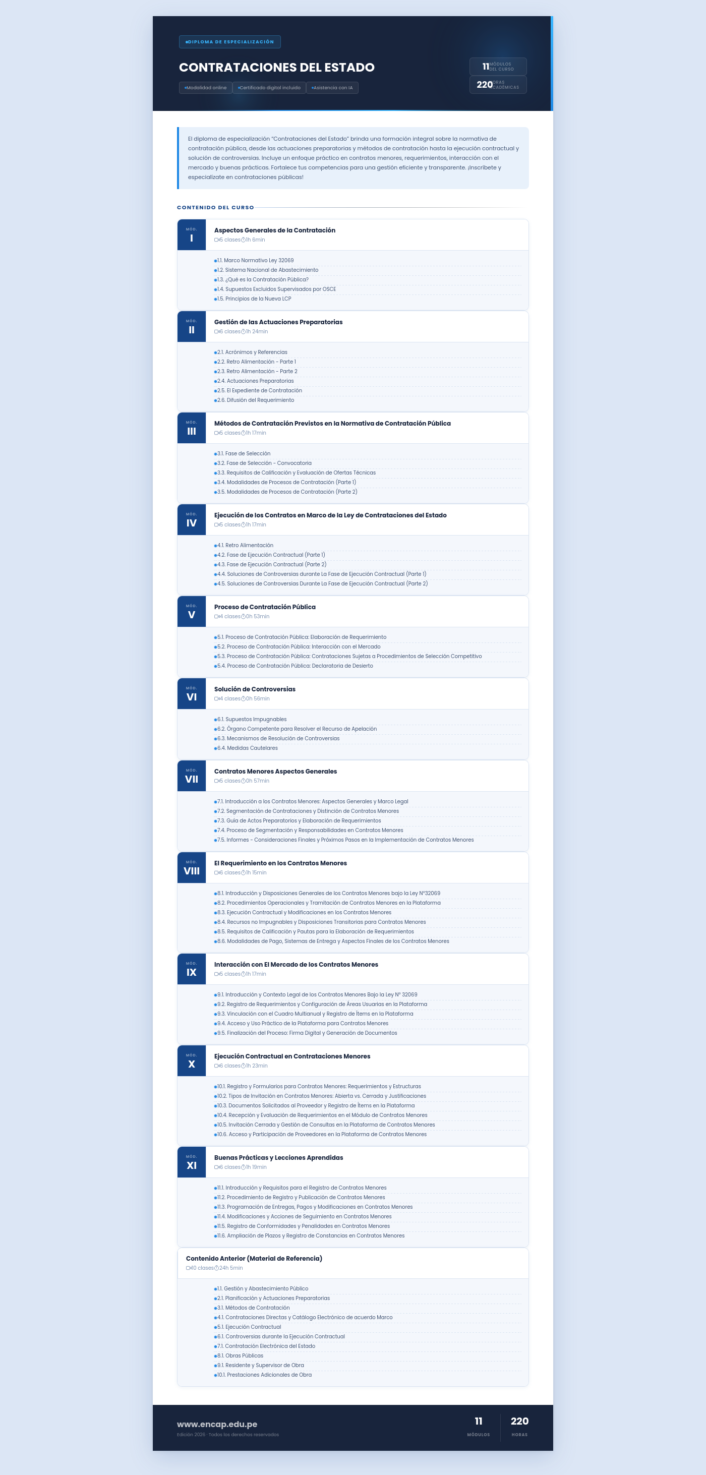 El diploma de especialización “Contrataciones del Estado” brinda una formación integral sobre la normativa de contratación pública, desde las actuaciones preparatorias y métodos de contratación hasta la ejecución contractual y solución de controversias. Incluye un enfoque práctico en contratos menores, requerimientos, interacción con el mercado y buenas prácticas. Fortalece tus competencias para una gestión eficiente y transparente. ¡Inscríbete y especialízate en contrataciones públicas!