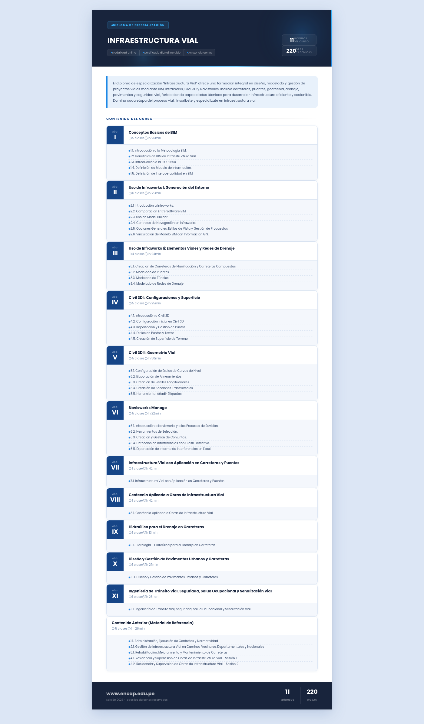 El diploma de especialización “Infraestructura Vial” ofrece una formación integral en diseño, modelado y gestión de proyectos viales mediante BIM, InfraWorks, Civil 3D y Navisworks. Incluye carreteras, puentes, geotecnia, drenaje, pavimentos y seguridad vial, fortaleciendo capacidades técnicas para desarrollar infraestructura eficiente y sostenible. Domina cada etapa del proceso vial. ¡Inscríbete y especialízate en infraestructura vial!